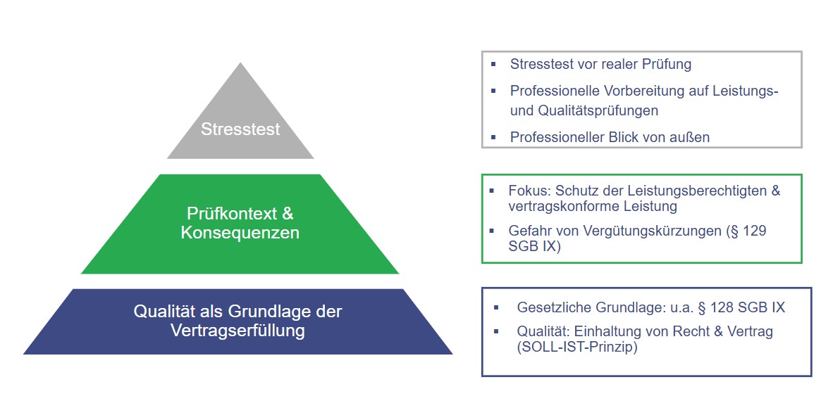 Wir unterstützen Sie dabei, optimal auf Prüfungen durch die Leistungsträger und die Wohn- und Teilhabebehörden vorbereitet zu sein. Unsere Herangehensweise: